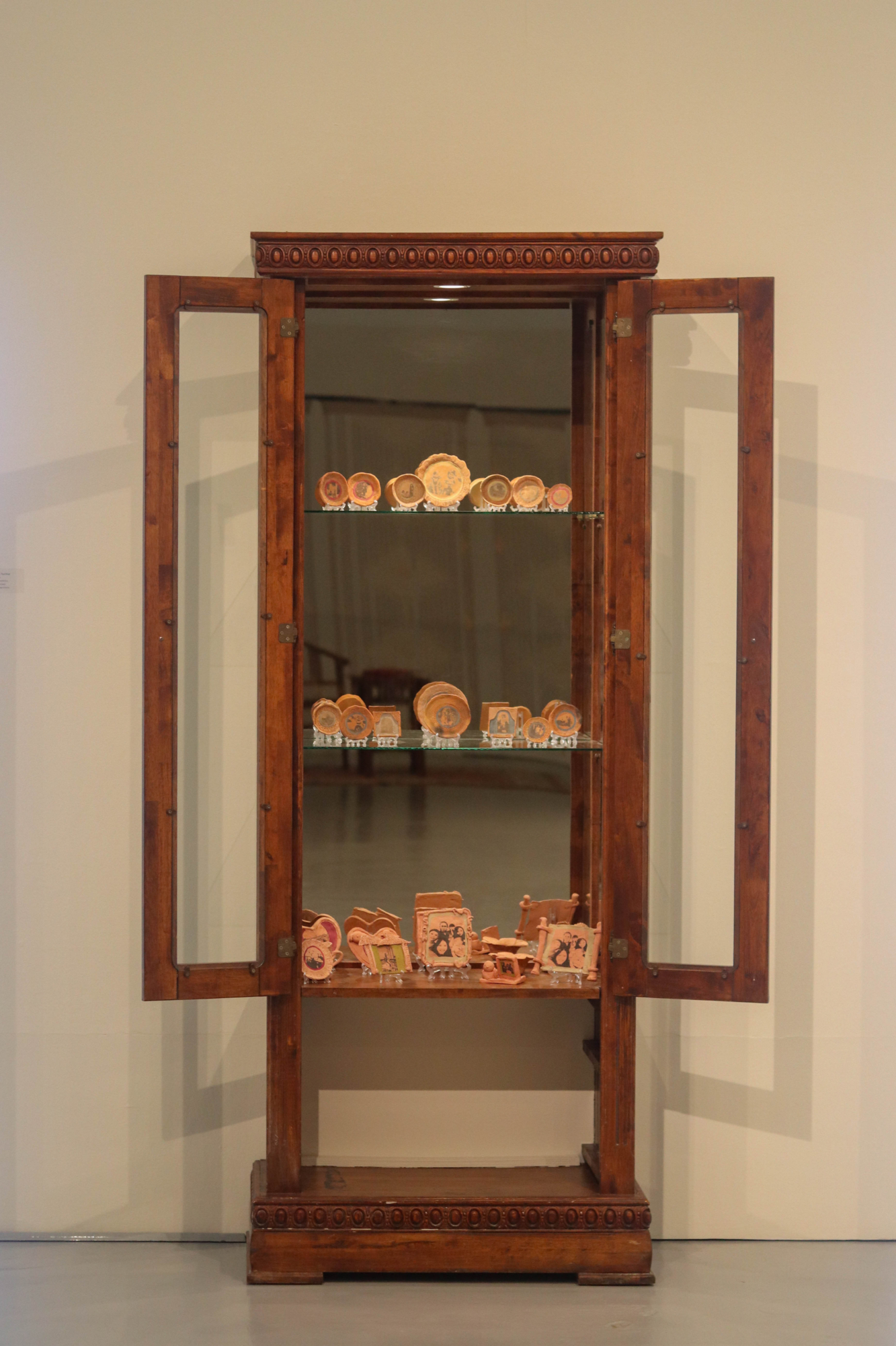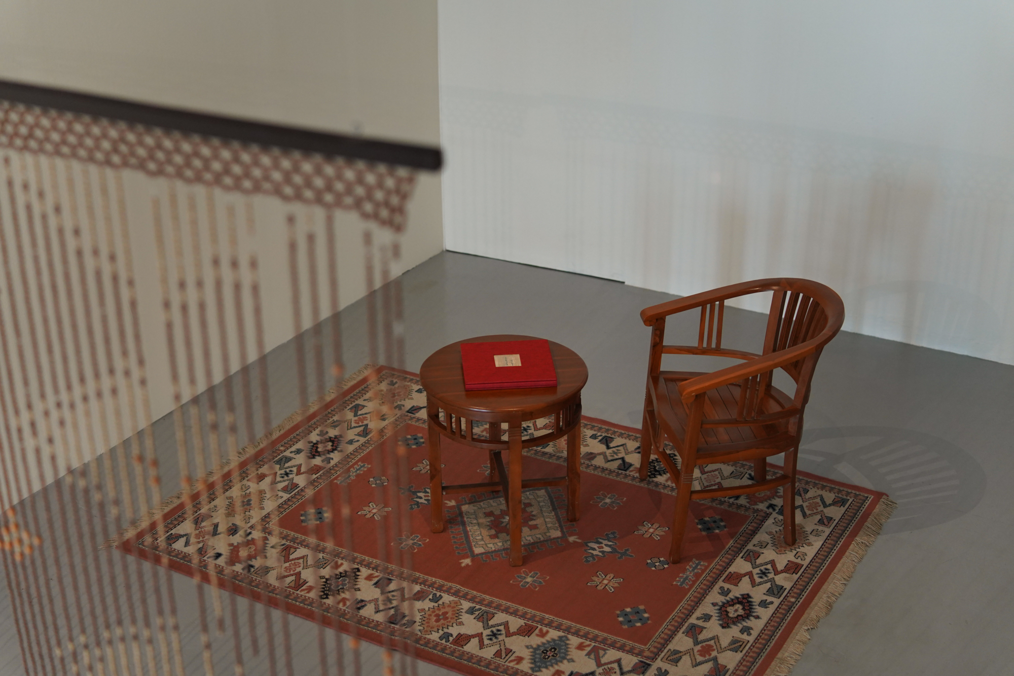 Inhabiting the space are an old wooden cabinet and table, an armchair, and carpet. In these dwell thick depositions of time, and memories as vestiges of past use. Arranged inside the cabinet are ceramic plates like those seen in souvenir shops. Resting on clear plastic stands, these tiny dishes seem to gaze out at us. The quaint sight of these little plates sets us instinctively at ease. On the plates are laser-printed photos from old albums handed down through generations of the artist’s family, but the figures are vague, and almost no identifying information is provided. This anonymity is a subtle consideration on the part of the artist, who in gifting us the intimacy of personal history, also attempts to preserve an inaccessible inner sanctum.