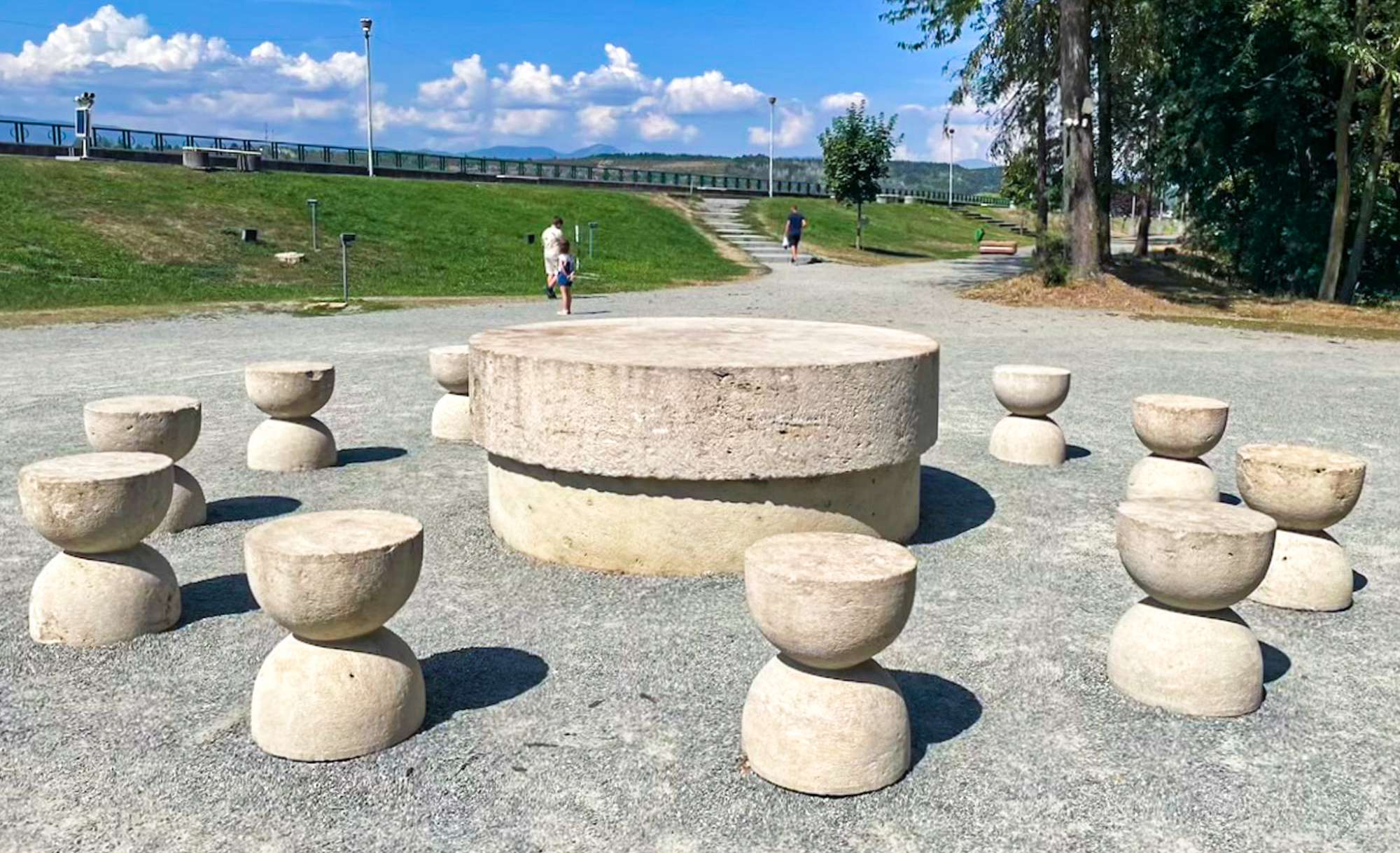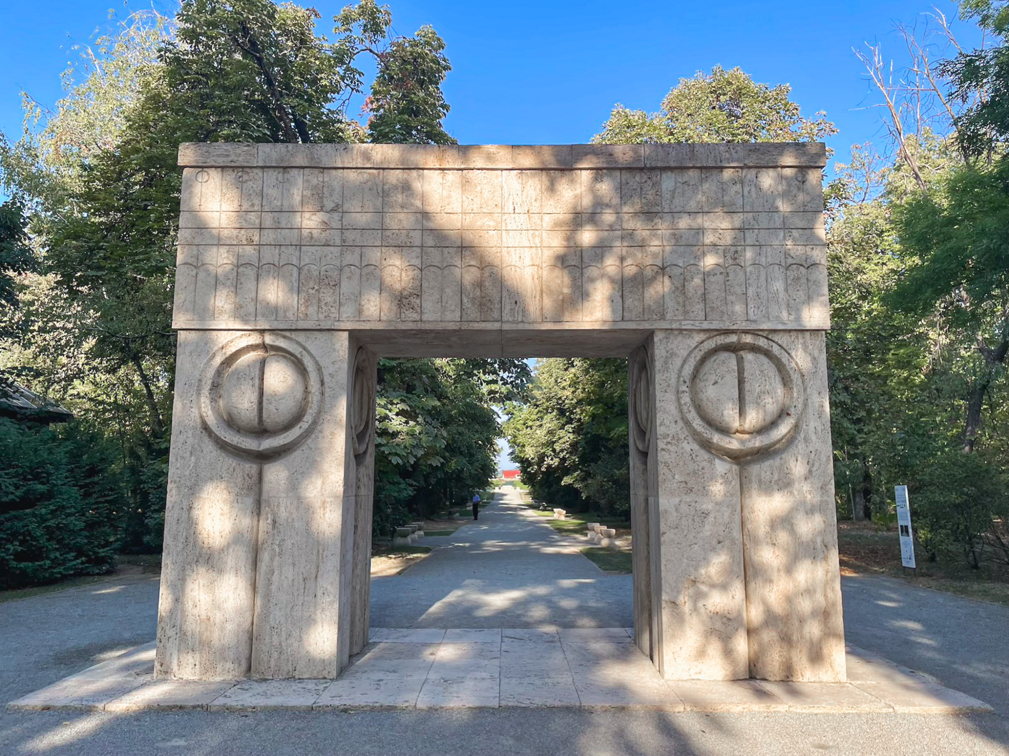 《無限柱》を含む『トゥルグ・ジウのブランクーシ彫刻アンサンブル』は、第1次世界大戦で没した地元の兵士を顕彰・追悼・鎮魂すべく1930年代後半に構想された。市内中心部を流れるジウ川の河岸からほぼ真東に伸びる、1・5キロメートルほどの軸線上に3つの作品が配置されている[*3]。最西端の市民公園に置かれた《沈黙のテーブル》は、直径2メートル強の円卓と砂時計のような形の丸椅子12脚から成る。同じく公園内の《キスの門》は高さ5・2×幅6・6メートルほどの堂々たる門。やはりブランクーシがデザインしたいくつかの椅子やベンチも含め、素材はいずれも石灰岩である。