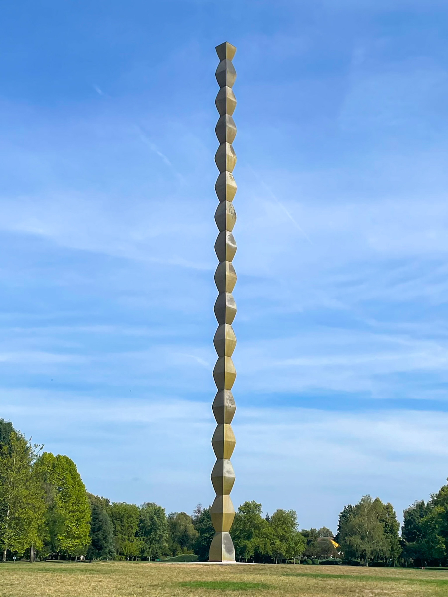 「英雄通り」と名づけられた軸線の真ん中にはルーマニア正教の教会があり、東端のやや高台にある別の公園に高さ30メートル弱の《無限柱》が建てられた。ミルチャ・エリアーデが言うように垂直の世界軸(アクシス・ムンディ)[*4]として、水平の軸線の端から天に向かってすっくと伸びている。アンドレは「[《無限柱》は]地面の束縛という限界を超えて地下に下降した」[*5]と述べているが言わずもがなだろう。蒼穹を支える柱は「世界樹」にほかならず、大地をも支えていることは自明である。作品を構成する角錐形の鉄製モジュールは上下両端のみ半分の大きさ。彫刻と台座の関係を考え抜いた作家は、半分のモジュールを天地の双方を支える世界樹の根=台座に見立てたのではないか。