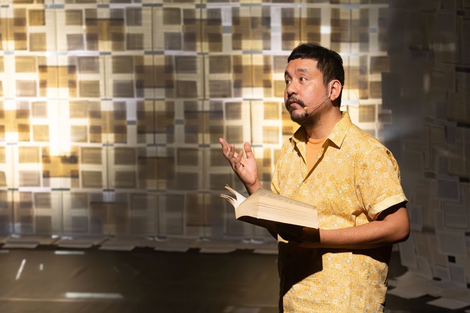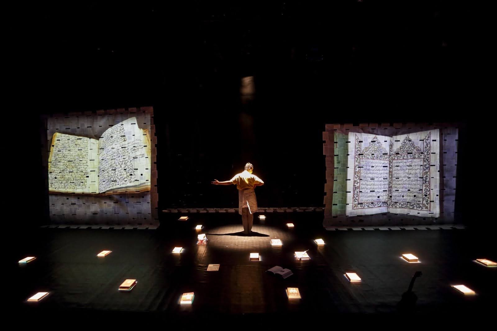 ライティングやプロジェクション、ライブ音楽の効果が際立つ舞台上には、トゥアにまつわる幾つもの現物の書物が、時を止めたかのように佇んでいる。その背後には、膨大なアーカイブ資料が、まるで織物のように折り重なり、「歴史の断片」として広がっている。それらは沈黙することなく、舞台の動きに呼応し、もうひとつの「視線」として機能する。長年にわたりトゥアに関する歴史書や物語を記してきた研究者や作家たちの眼差しが、文字を超えて舞台に現れ、声なき囁きのように観客席の暗がりを漂う。その気配が、作品全体に独特の緊張感を張り巡らせていた。