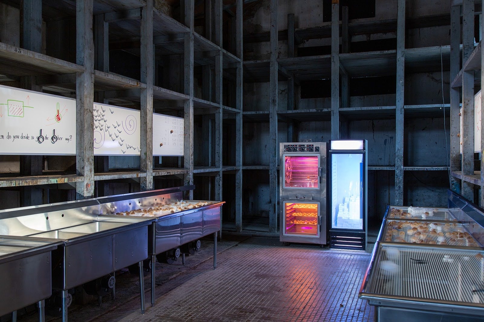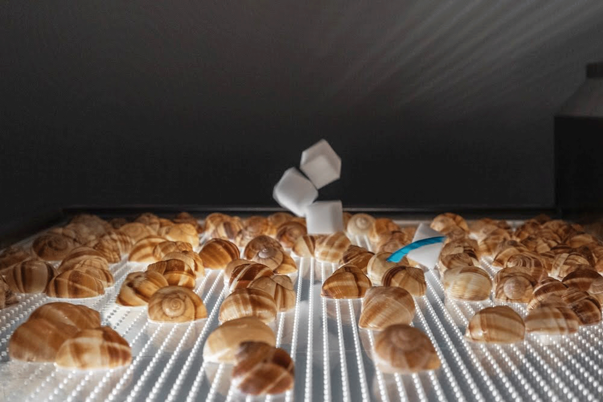 インスタレーションを作る時も同じです。ベネチアのときは現場視察をしにいったときに雰囲気をみて、業務用のシンクとか冷蔵庫を設置したくなったんです。あと、その時気になっている人がケーキ屋さんだったんで、こういう業務用ツールに興味があった笑 シンクの上にカタツムリを載せたのは、3歳の息子がハマっていたのがカタツムリの収集で、カタツムリに関する本を借りて読み聞かせをしていたんです。そこでカタツムリには右巻きと左巻きがあるみたいなことを知って、興味を持っていて。ベネチアで現場視察をしていたときに会場の外にでたら偶然、足元にカタツムリがいたので、運命じゃん!ってなったんです。
