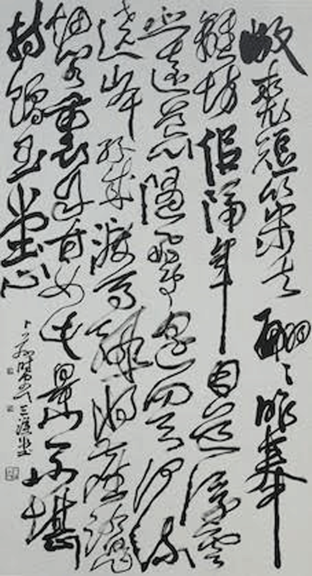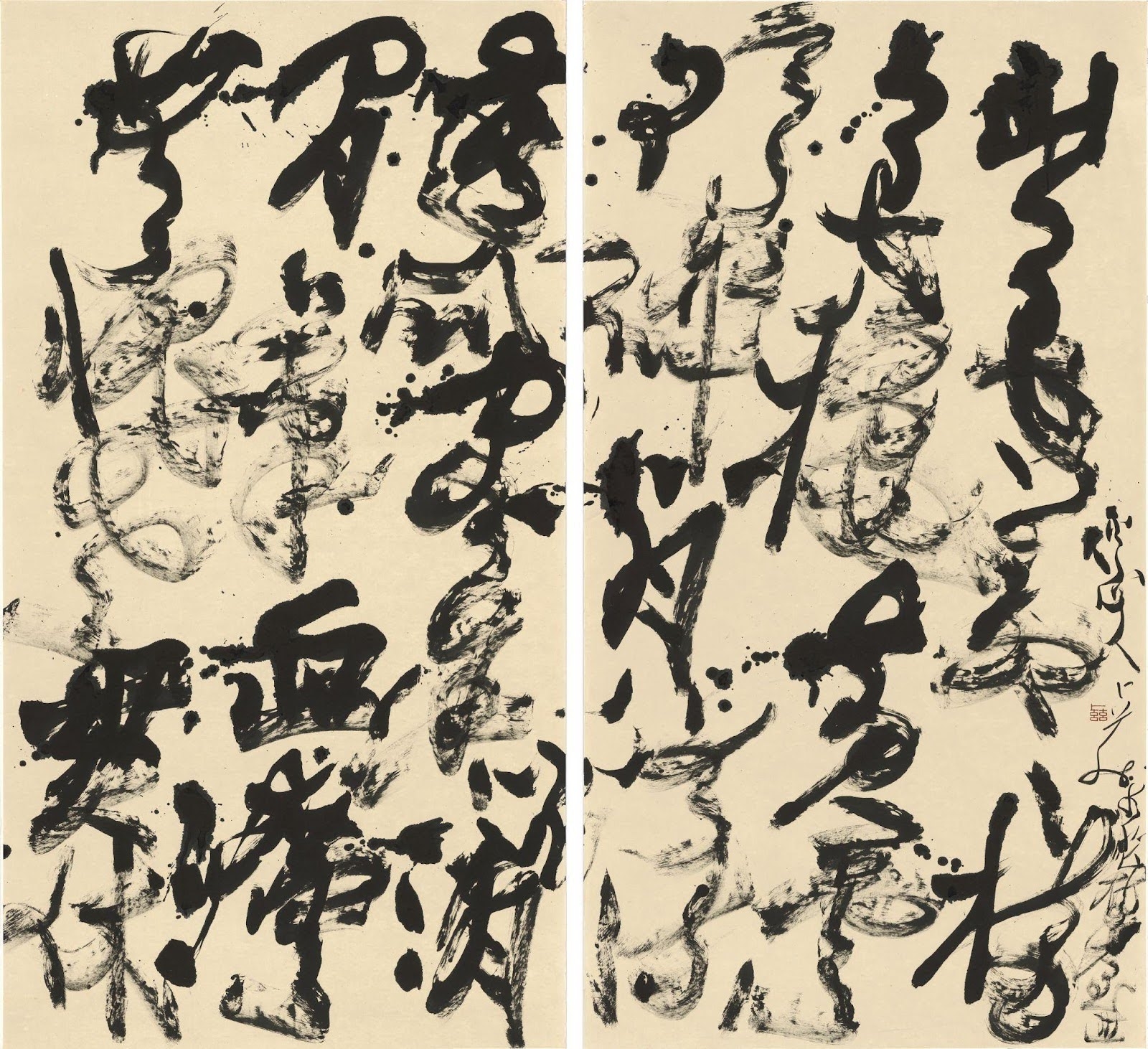 日本では途絶えた、古典書からの歴史的連続性を踏まえた前衛書、それが21世紀の台北で見つかったのである。それは卜茲(Pu Tzu (Bu Zi); 1959-2013)の、とりわけ晩年の作品であった。アートフェア会場(Xi Zhi Tang Galleryのブース)と、さらに折良く市内の異雲画廊の二箇所で彼の作品展が開かれていた。ご覧のように、様々な書体を使い、激しく回転し、炎のように揺らぎながら、単語や一字書ではなく、長い詩文・散文を紡ぎ続ける書である。作家の制作風景の映像を見ると[*5]、まるで即興のような信じられないスピードでぐいぐい書きすすめている。卜茲の一種の狂草が、揚州八怪を参照していたかどうかはわからない。作品の1つは黄庭堅の変奏であったから、彼は石川九楊の言う「無限折法」とは異なる道を探求していたのかもしれない。