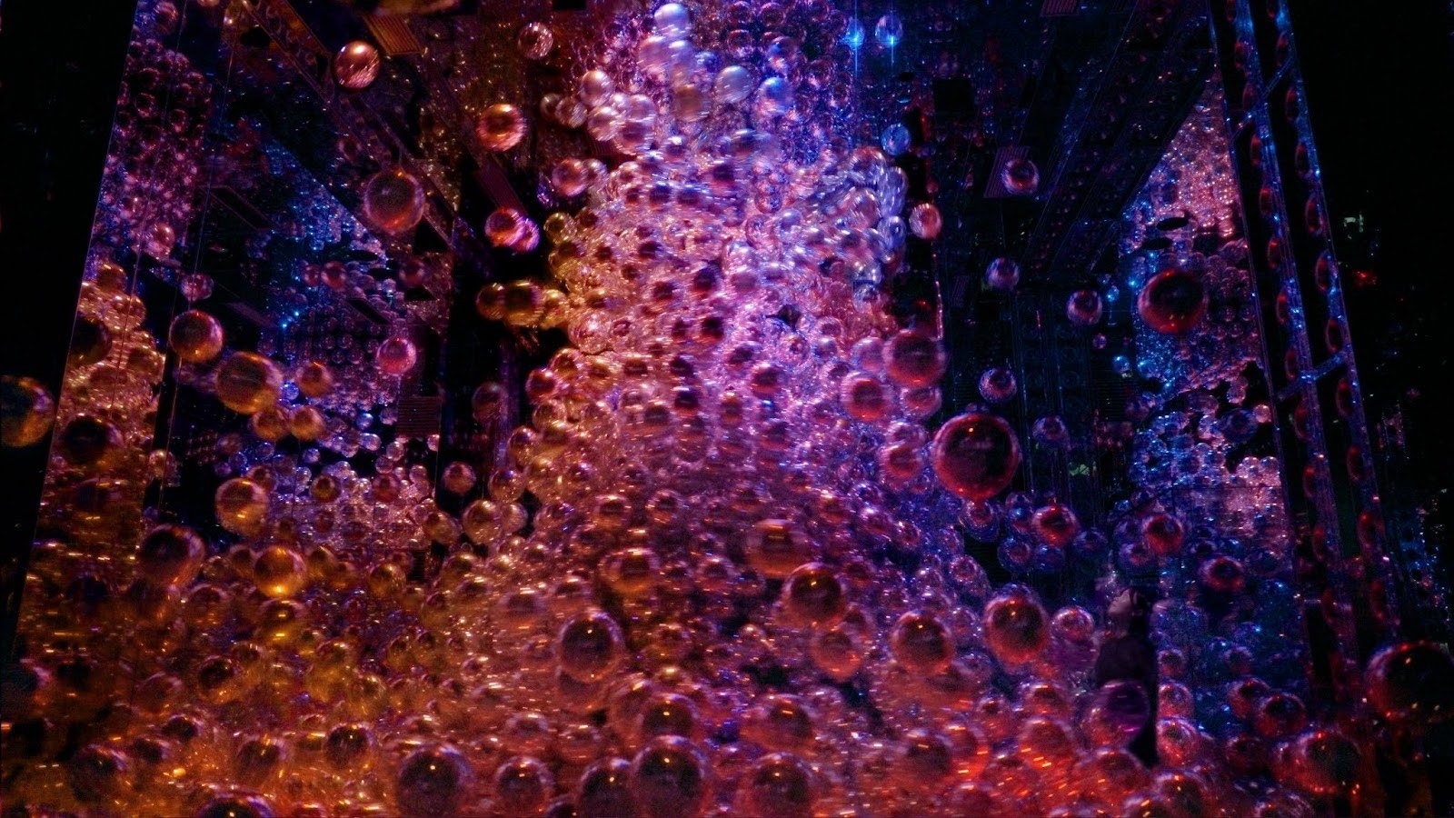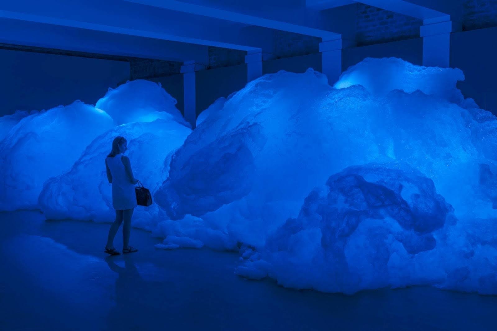 天井の高い空間に雲のような泡の塊が浮遊している。来場者は、ガラス越しに塊の動きを見るだけでも、泡の付着を防ぐ服とゴーグルに身を包んで空間内を歩くのでもいい。泡は「構造的には細胞膜と同じ」で、「生物の構成単位である細胞」に見立てられているらしい。【*15】