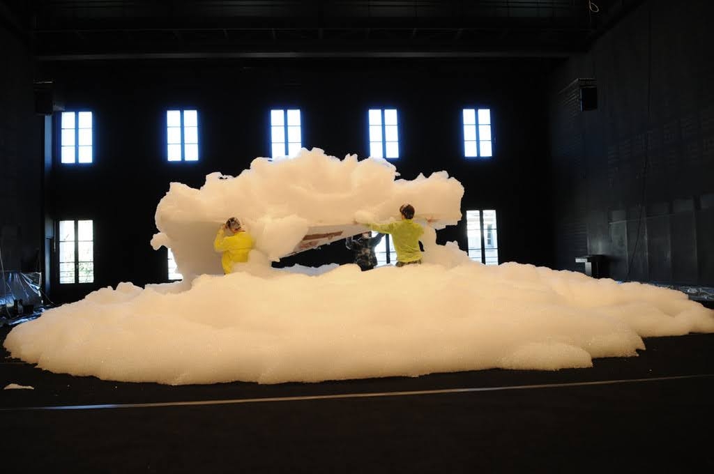 同様の泡は、2作に先立って、振付家マチルド・モニエと造形作家ドミニク・フィガレラの協働作品《ソープオペラ》(2009- )【*17】と《ソープオペラ、インスタレーション》(2014- )【*18】でも用いられている。ここで泡は、終始舞台上にあって重要な装置として機能する。ダンスにおける根源的な前提条件である重力を、演者とともに可視化する役割を担っているのだ。
