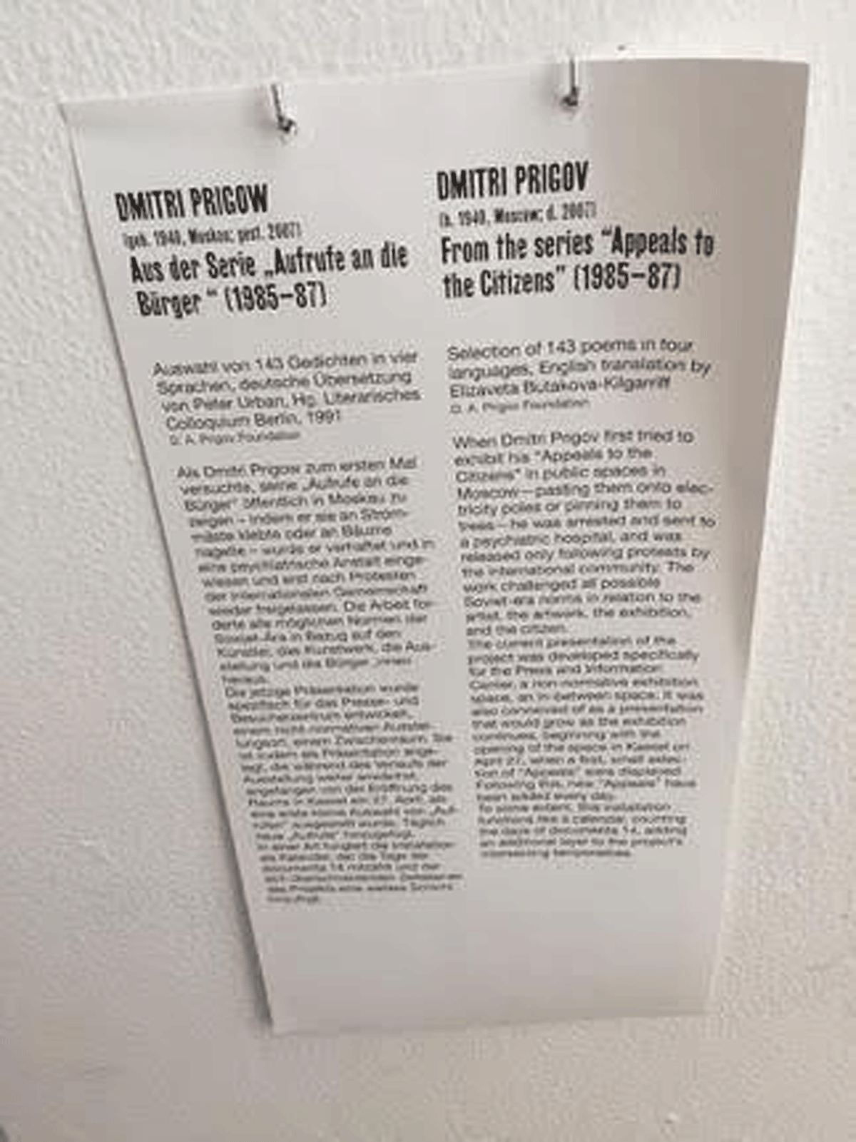 “ドミトリー・プリゴフが初めてモスクワの公共空間で『市民への訴え』を展示しようとした際、電柱に貼り付けたり木にピンで留めたりしたため、彼は逮捕され精神病院に送られたが、国際社会の抗議を受けてようやく釈放された。この作品は、芸術家、作品、展覧会、市民、そしてソビエト時代のあらゆる規範に挑戦した。”(図3右より)