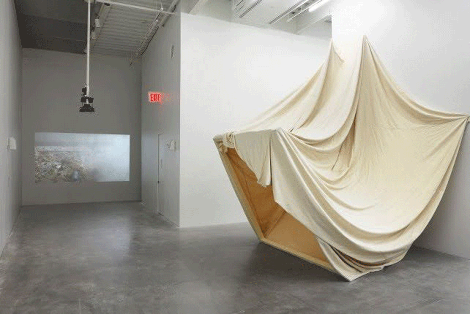 もうひとつの作品、ライアン・タベット(Rayyane Tabet)による《1989》は、壁の高い位置に埋め込まれた扉と、垂れ下がるキャンバス製の「壁」によって窓枠とつながれた構造を特徴としています。実は、これらの建築的要素は、作家が幼少期を過ごした実家の寝室にあったものです。