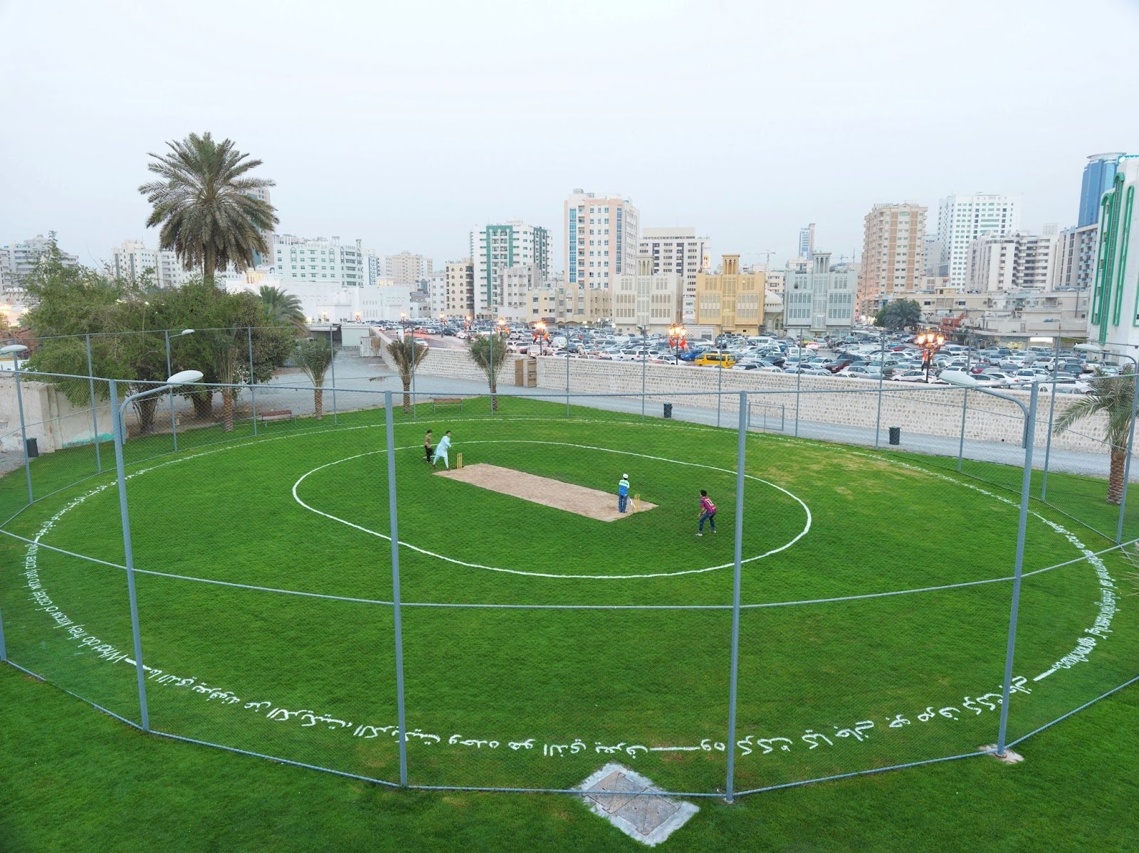 縮尺を抑えたクリケット上に書かれたテキストは、現地周辺で主に話されている二つの言語であるウルドゥー語とアラビア語に翻訳されています。このフィールドは定期的に子どもたちに開放されており、2022年にはシャルジャ・ビエンナーレ15に合わせて修復されています。