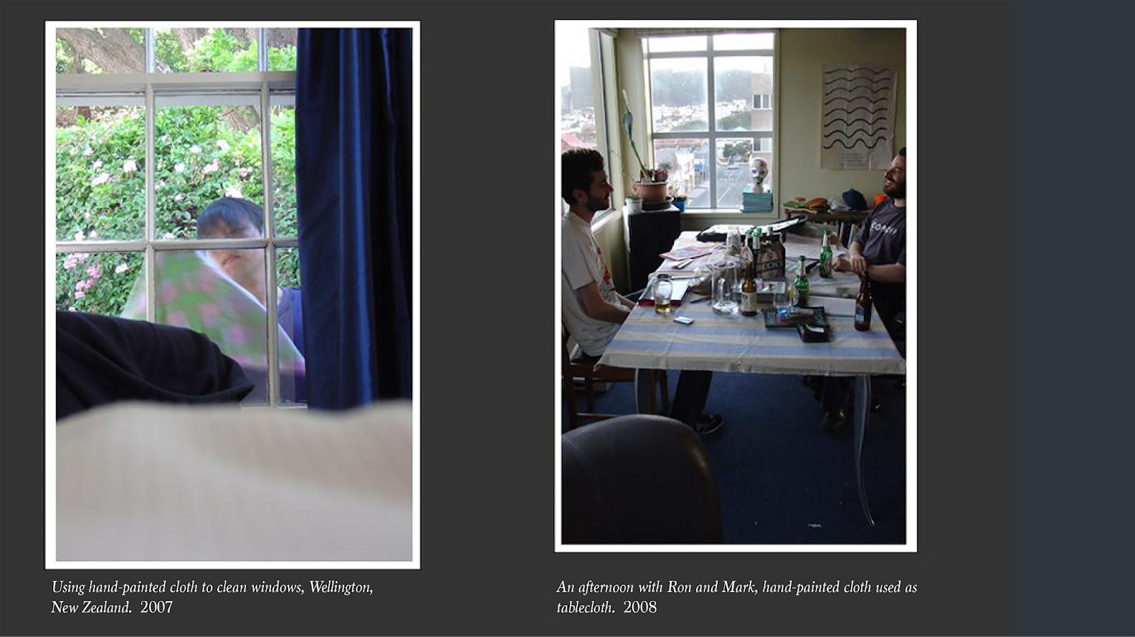 Right:An afternoon with Ron and Mark, hand-painted cloth used as tablecloth. 2008