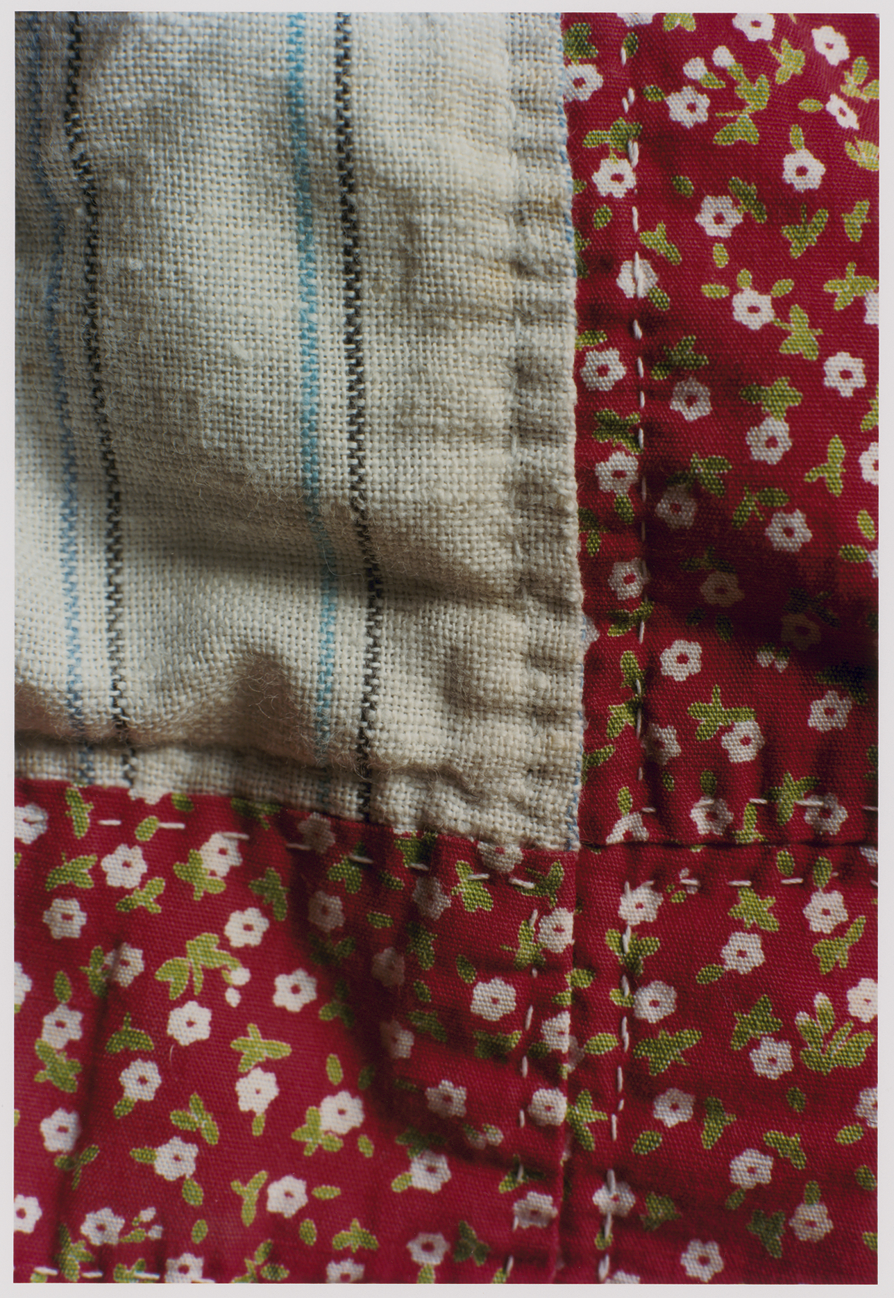 田附勝にはKAKERAというシリーズがある。各地の博物館を訪れて、縄文土器のかけらを、収蔵箱の下敷きになっていた当時の新聞とともに撮影するものである。1万年続いた縄文時代、新聞に切り取られた収蔵時の時間(昭和初期〜)、そしてそれを「いま」見ている我々の現在、さらには、我々の文明もまたKAKERAとなるだろう遠い未来を重ね合わせた作品である。おそらく母のキルトの写真を撮るうちに作家は、それが写真を撮り(断片にし)写真集や展覧会を構成する(継ぎ直す)行為と何ら変わらないことに気がついたのだろう。