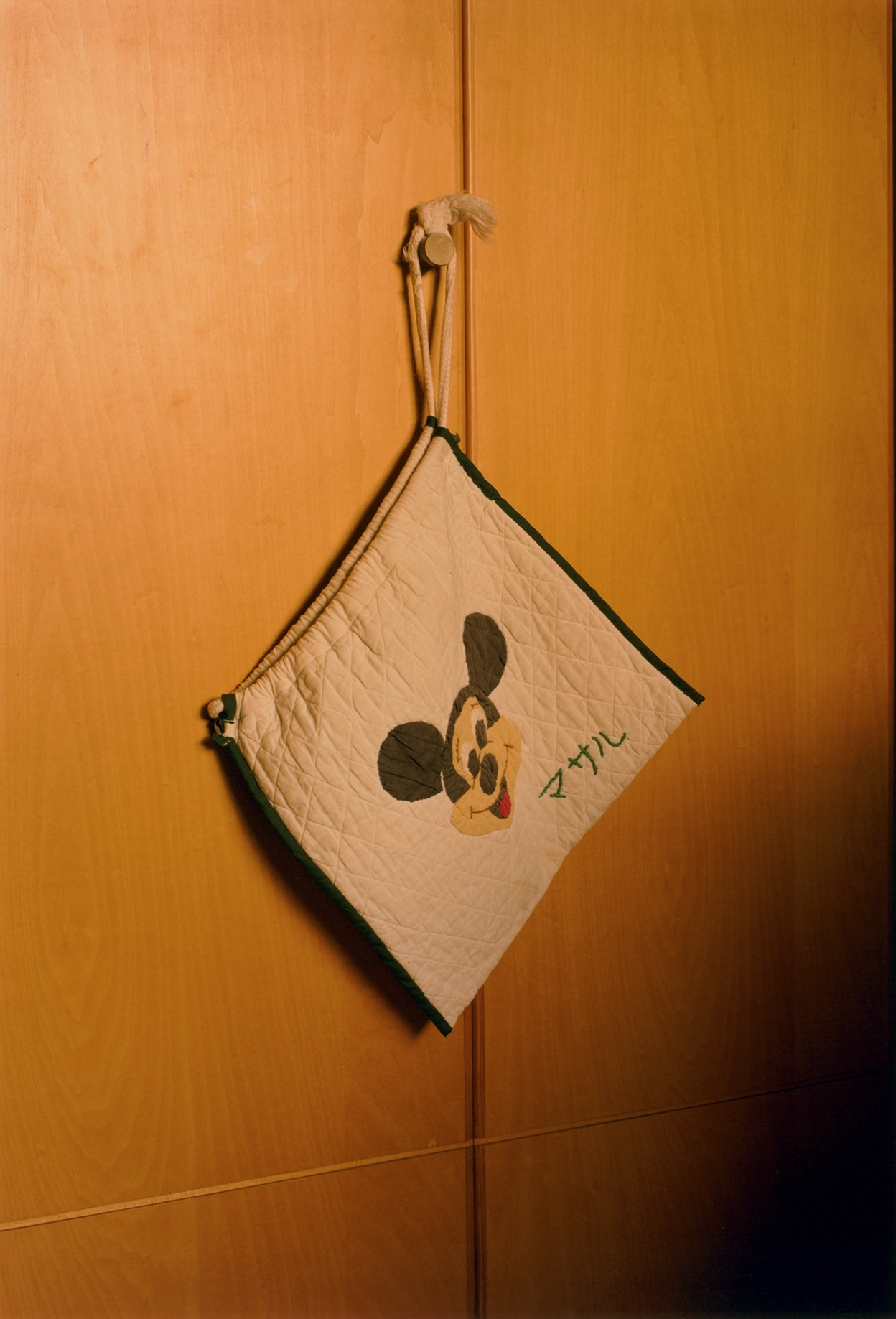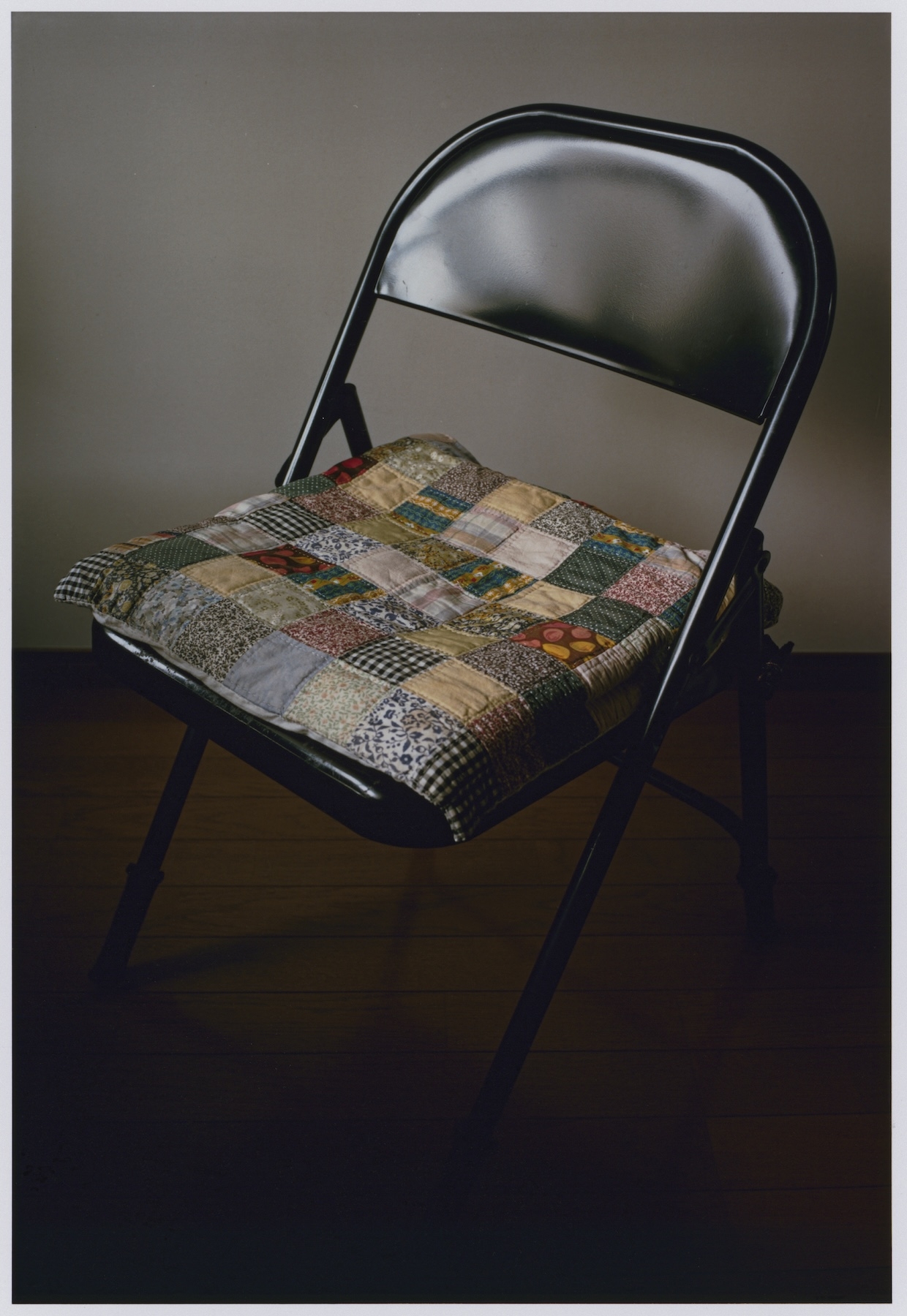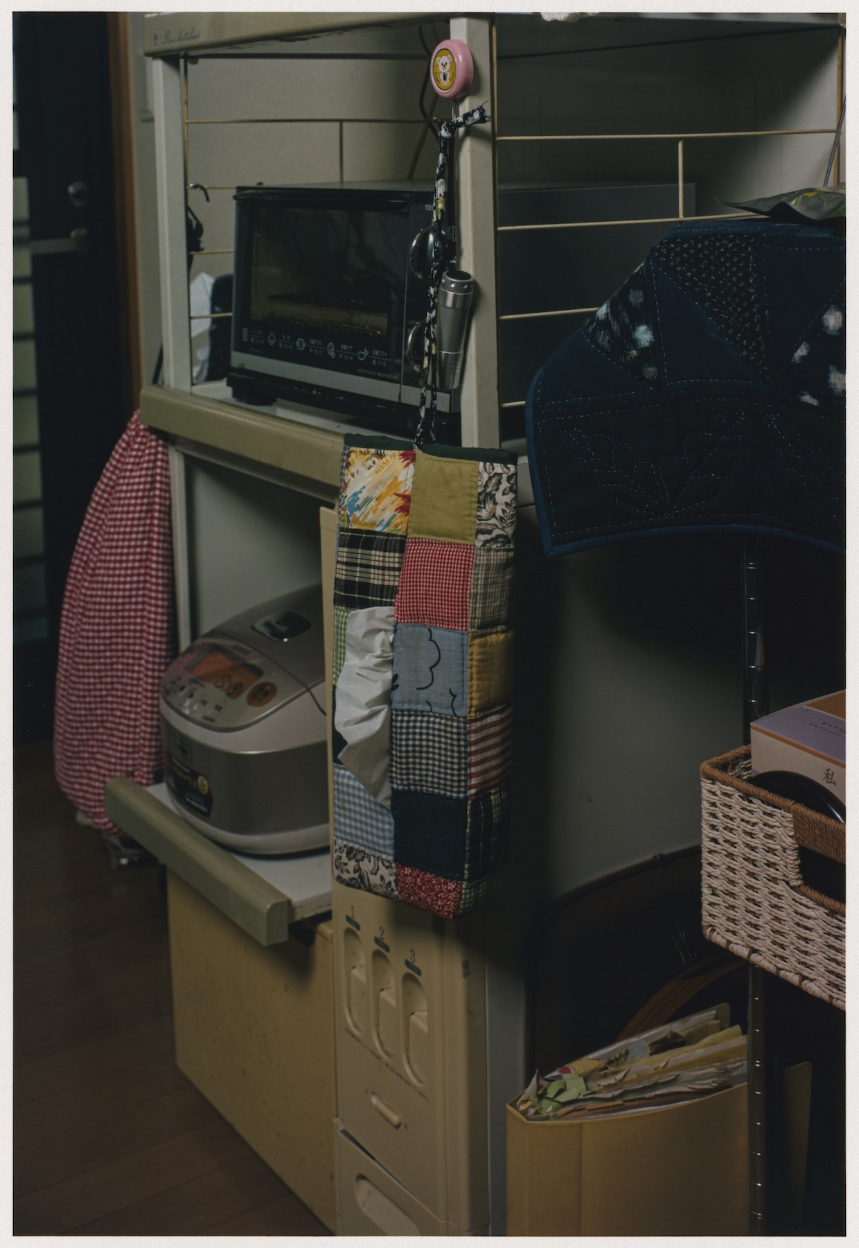 2枚目から遺品の静物写真が始まる。以降、順に見ていけば、裁縫箱の中。片隅に置かれたキルトのバッグ。キルトの縫い目の接写写真(多数)。キルトのティッシュケース。可愛いキャラクターやぬいぐるみ、アップリケ。キルトの壁掛け(複数)、つややかな薬缶とキルトの鍋敷き、鍋つかみ(キッチンの片隅)。電気ヒーター(?)のカヴァー(ミッキーマウスのワンポイント付き、もちろんキルト)。「Reiko」(妹だろう)のためのキルトのポシェット。「マサル」(兄の方である)のためのキルトの巾着(ミッキーマウスのアップリケ付き)、キルトのベッドカヴァー、折りたたみの椅子と四角いキルトのクッション、キルトの材料となる端切れ。母の裁縫仕事の作業台(暗がり)、母のポートレート、主を失ったリヴィングソファとキルトの壁掛け。
