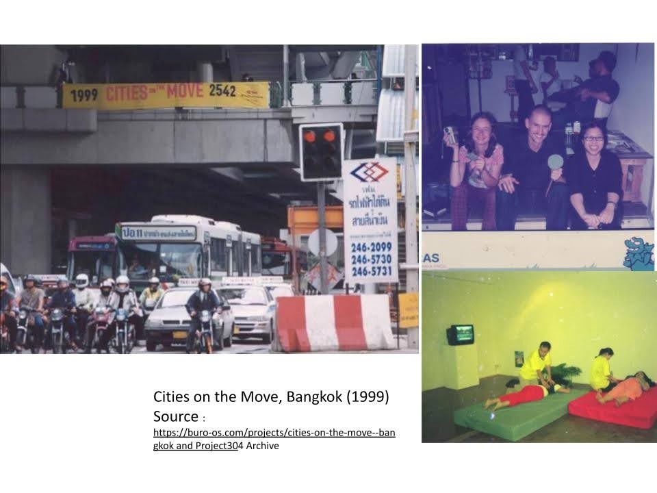 1990年代の終わりは、タイのアートシーンにとって大きな転換期にあたる。というのも、当時、ヨーロッパを中心に巡回していたアジアの急速な都市化・グローバル化・社会変容を芸術的に可視化した展覧会「Cities on the Move」(1997–1999)[*4]の、巡回開催地にバンコクが選ばれたのだ。