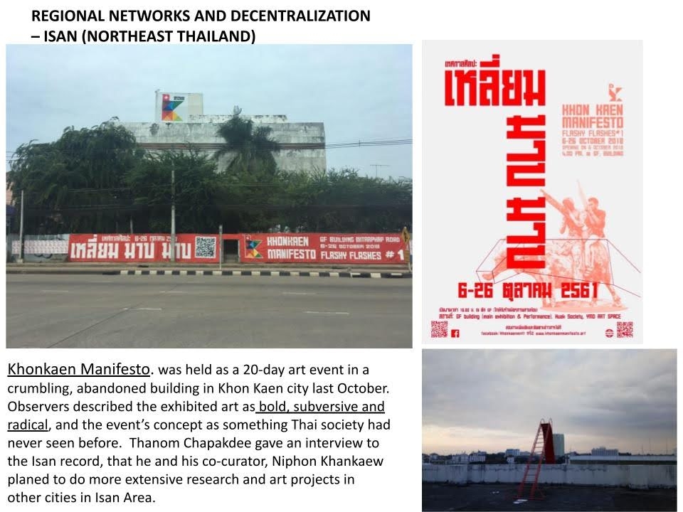 イーサン地方と呼ばれる東北部は、これまでアートに関する目立った動向が見られなかった。しかし近年、東北部出身のアーティストが地方に戻り、活動を行う傾向にある。コーンケーン(Khon Kaen)では、市内の古い建物を会場として活用する市民参加型プロジェクト「コーンケーン・マニフェスト(Khon Kaen Manifesto)」が開催されており、インサーン出身で美術評論家のThanom Chapakdee(タノム・チャパクディー)がキュレーションを行う。