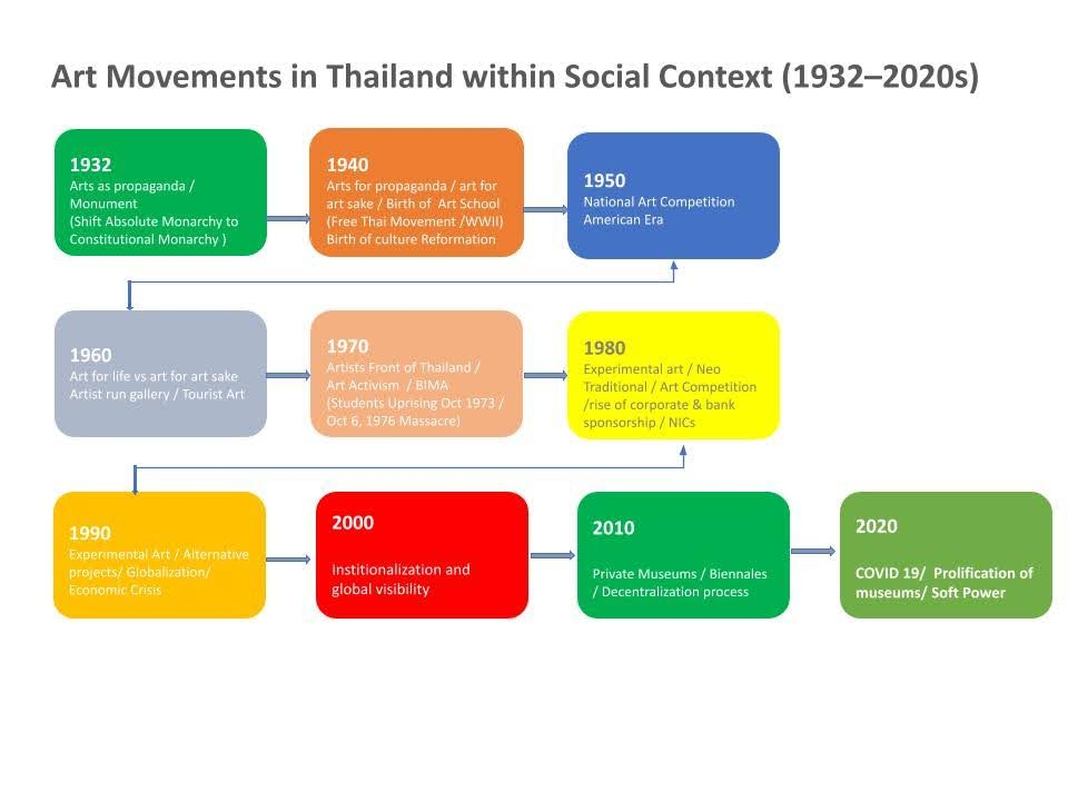 現在、タイでは都市と地方を結ぶ多様な現代美術の活動が全国的に拡大している。中央では大規模な商業施設の建設や商業イベントの開催が増加する傾向にある。タイ東北部のイーサン地方では、タイ初の大規模アート・フォレスト「カオヤイ・アート・フォレスト 」が開催され、話題を呼んだ。2026年はチェンマイやバンコクで3〜4館の美術館が開館予定である。