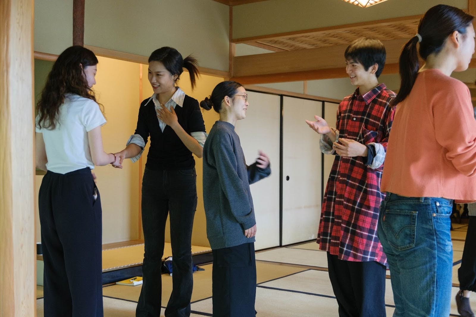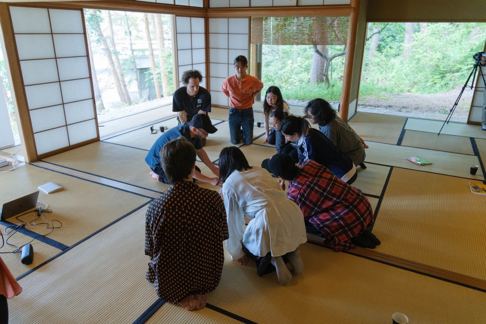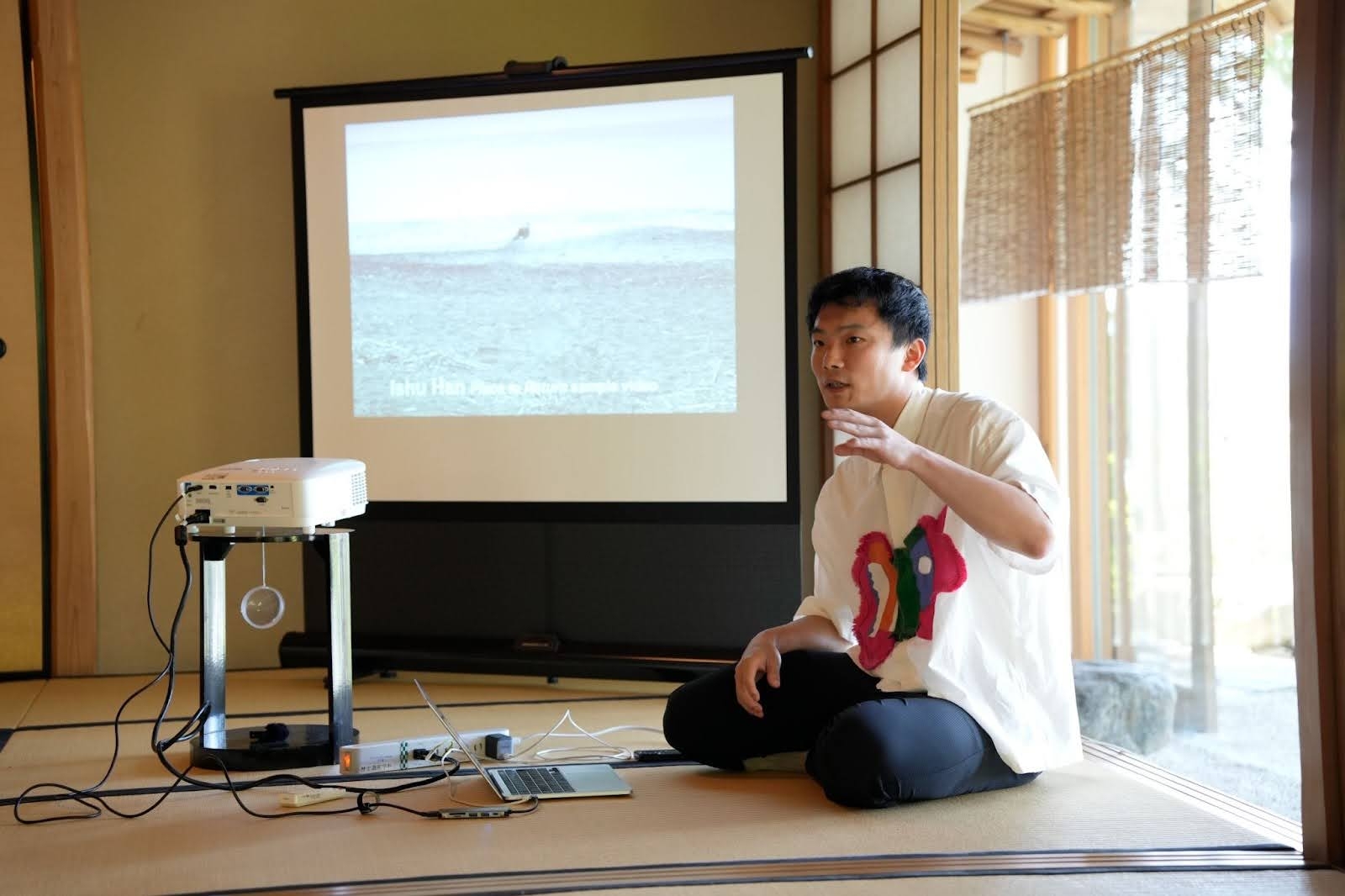 2025年6月7日、Kyoto Gatheringでもメイン会場として想定しているお茶室「千秋堂」で、荒木を講師に迎え、「知らないで入る01」が行われた。10人の参加者に、英語はあまりわからないという学生と、日本語は少ししかわからないという留学生が混ざる。冒頭にアイスブレイクとして荒木が独特な自己紹介セッションを参加者に課した。それぞれ他の参加者と握手しながら挨拶していくのだが、挨拶するたび相手の名前になる、というものだ。つまり自分の名前はどんどん入れ替わっていく。この、自分につけられたラベルを次々と貼り替えていくような体験の、不思議な感触がワークショップの最後まで空間に残る。