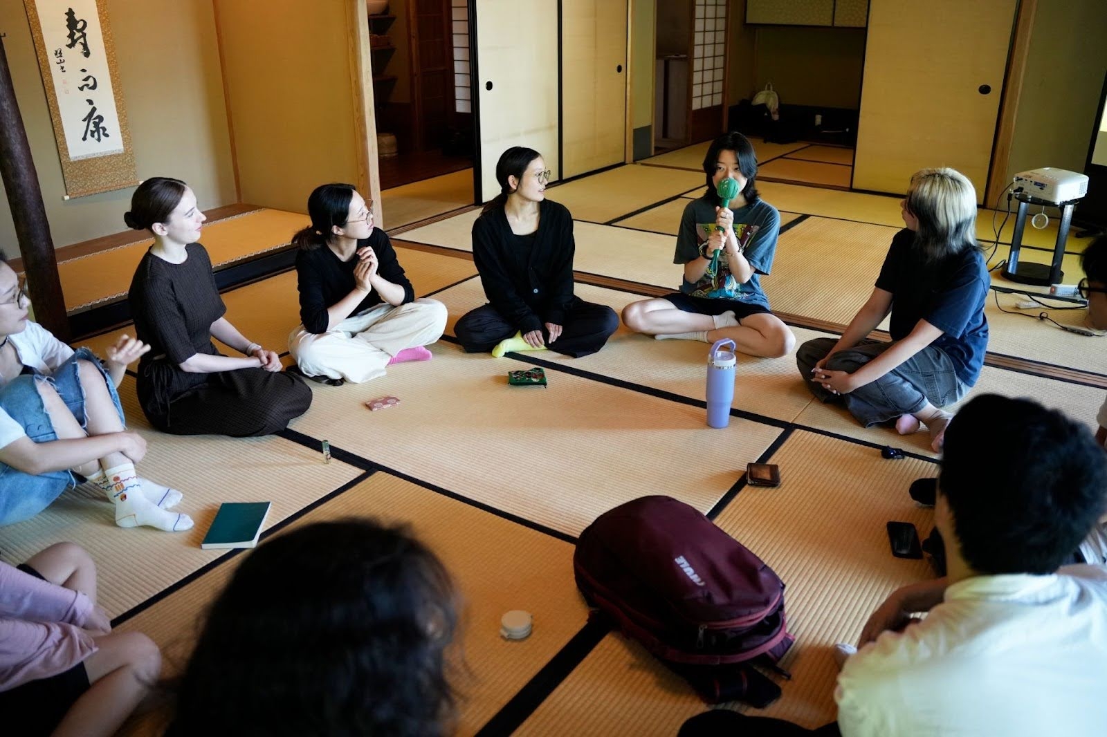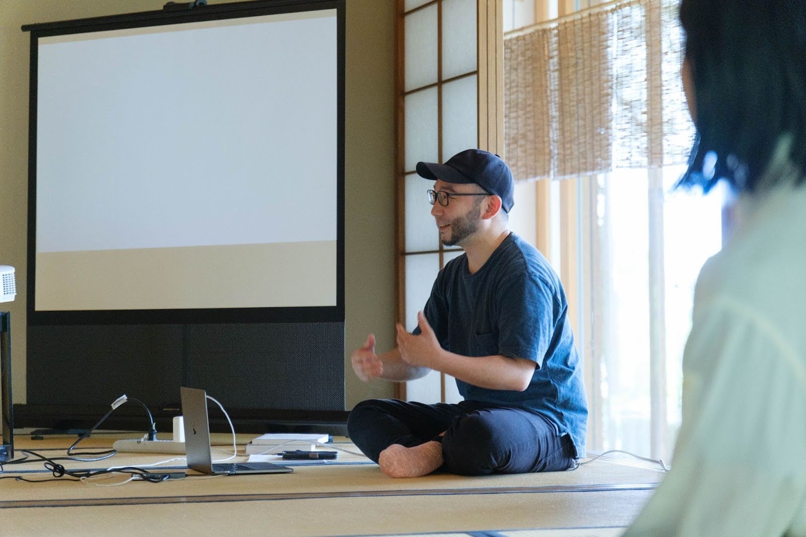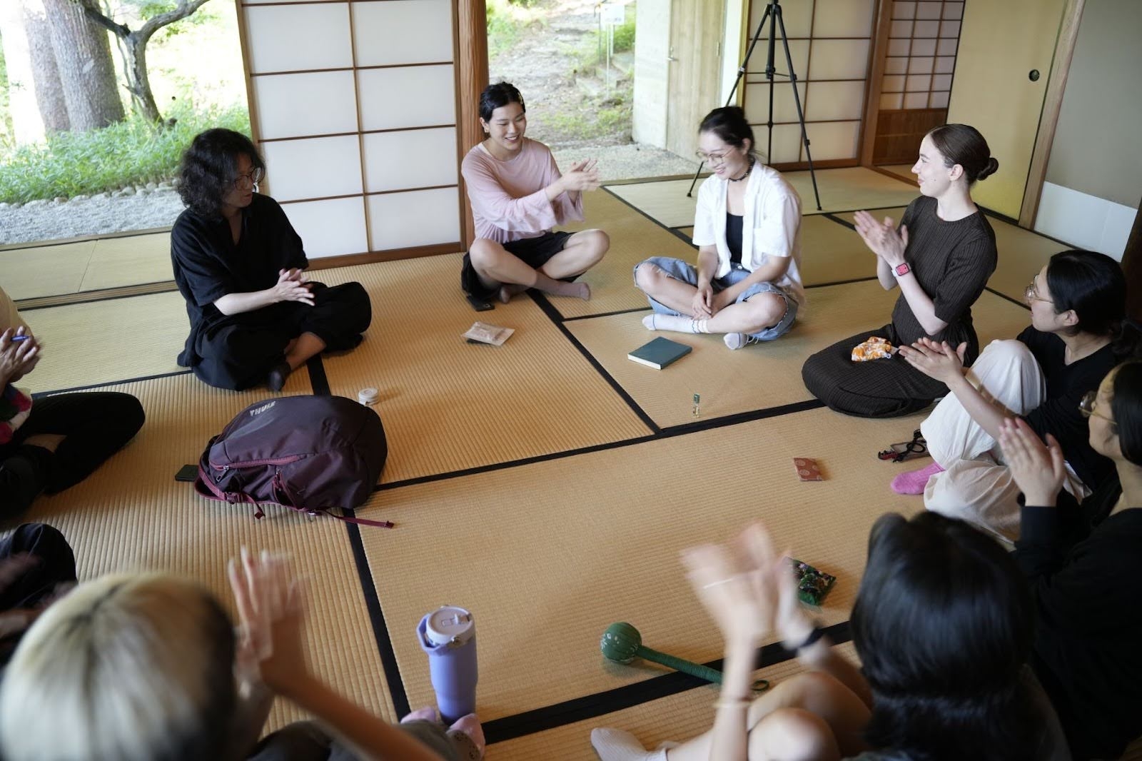 2025年6月7日、Kyoto Gatheringでもメイン会場として想定しているお茶室「千秋堂」で、荒木を講師に迎え、「知らないで入る01」が行われた。10人の参加者に、英語はあまりわからないという学生と、日本語は少ししかわからないという留学生が混ざる。冒頭にアイスブレイクとして荒木が独特な自己紹介セッションを参加者に課した。それぞれ他の参加者と握手しながら挨拶していくのだが、挨拶するたび相手の名前になる、というものだ。つまり自分の名前はどんどん入れ替わっていく。この、自分につけられたラベルを次々と貼り替えていくような体験の、不思議な感触がワークショップの最後まで空間に残る。