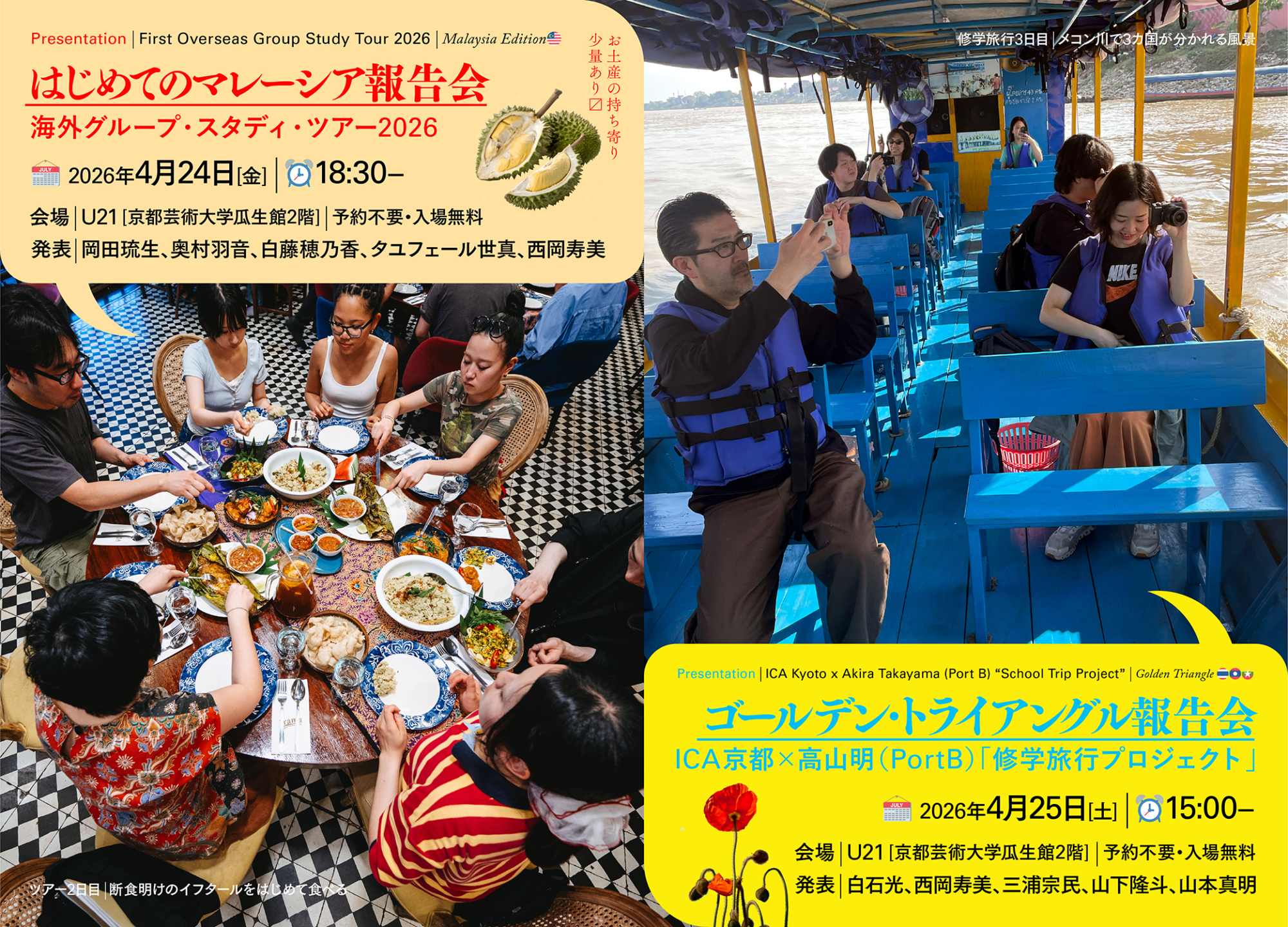 アーティストの高山明氏(PortB)との協働による「修学旅行プロジェクト」では、タイ・ラオス・ミャンマーの国境地帯「ゴールデン・トライアングル」を、また、渡航経験が少ない学生を対象とした「はじめての海外グループ・スタディー・ツアー」ではマレーシアの3つの都市を、それぞれ訪れました。